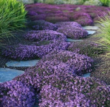 Kvapų gėlyne čiobrelių lova užima centrinę dalį, kur yra saulėta visą dieną. Čia pasodinta 60 vnt. 'Coccineus' veislės čiobrelių ir keletas kitų, kurių veislės nepamenu. Į čiobrelių lovą veda akmeninis takas, kuris šiuo metu jau visas užklotas čiobrelių kilimu. Šioje vietoje dirvožemis yra derlingas, todėl sodinant reikėjo pabloginti gruntą į kiekvieną duobutę pilant po saują žvyro ir permaišant su esamu dirvožemiu. Sodinukai buvo sodinami kas 40cm. Kilimas suaugo per vienerius metus.